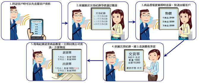 採用CASIO无线资料采集器,并搭配蓝牙印表机,将货车及每个客户当成分仓,从营业所总仓将货品调拨至货车,再从货车调拨至每个客户,因此可精准掌握每位客户的库存量,同时產生销货单、退货单等单据,并可列印签收单,回总仓后,盘点货车剩余库存,立即与出车时库存比对,自动产生盘差表。