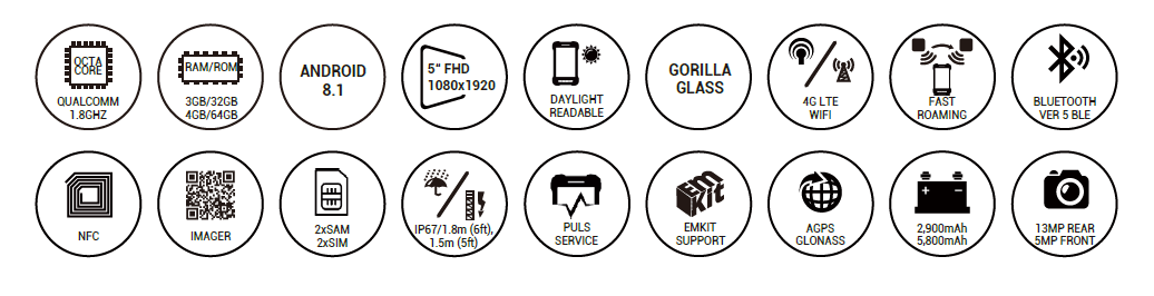 4G LTE, GPS, IEEE 802.11a/b/g/n/ac/d/h/i/k/r/v, BT, Camera, 2D Imager, NFC(选配) |